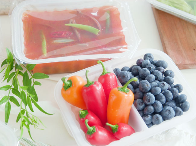 - 포장된 음식을 한눈에 볼 수 있어 깔끔해요 재생 수지를 섞지 않은 무색투명 용기를 사용하여 포장된 음식을 육안으로 한눈에 볼 수 있어요